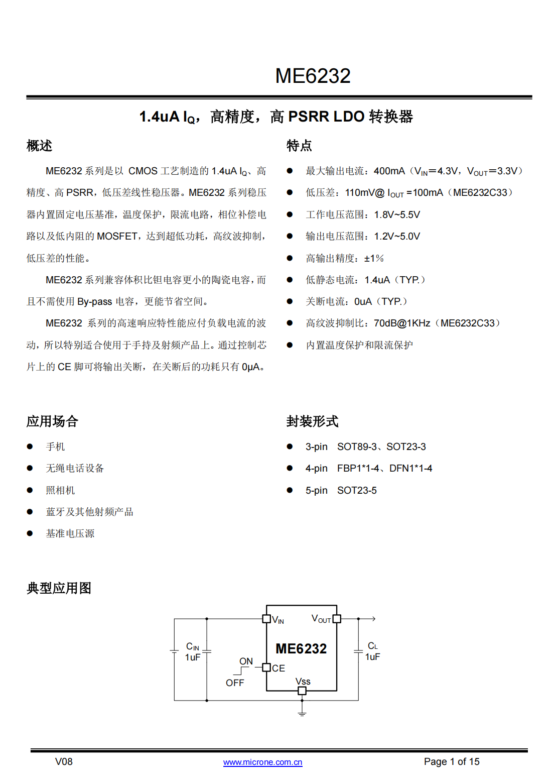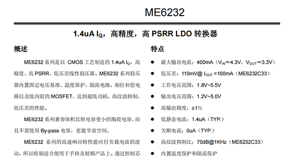 ME6232系列是以CMOS工艺制造的1.4uA IQ、高精度、高PSRR,低压差线性稳压器。ME6232系列稳压器内置固定电压基准,温度保护,限流电路,相位补偿电路以及低内阻的MOSFET,达到超低功耗,高纹波抑制,低压差的性能。ME6232系列兼容体积比钽电容更小的陶瓷电容,而且不需使用By-pass电容,更能节省空间。ME6232系列的高速响应特性能应付负载电流的波动,所以特别适合使用于手持及射频产品上。通过控制芯片上的CE脚可将输出关断,在关断后的功耗只有0μA。